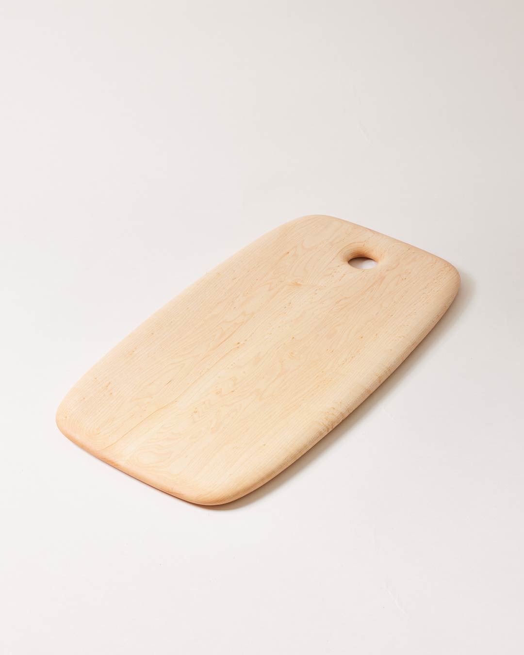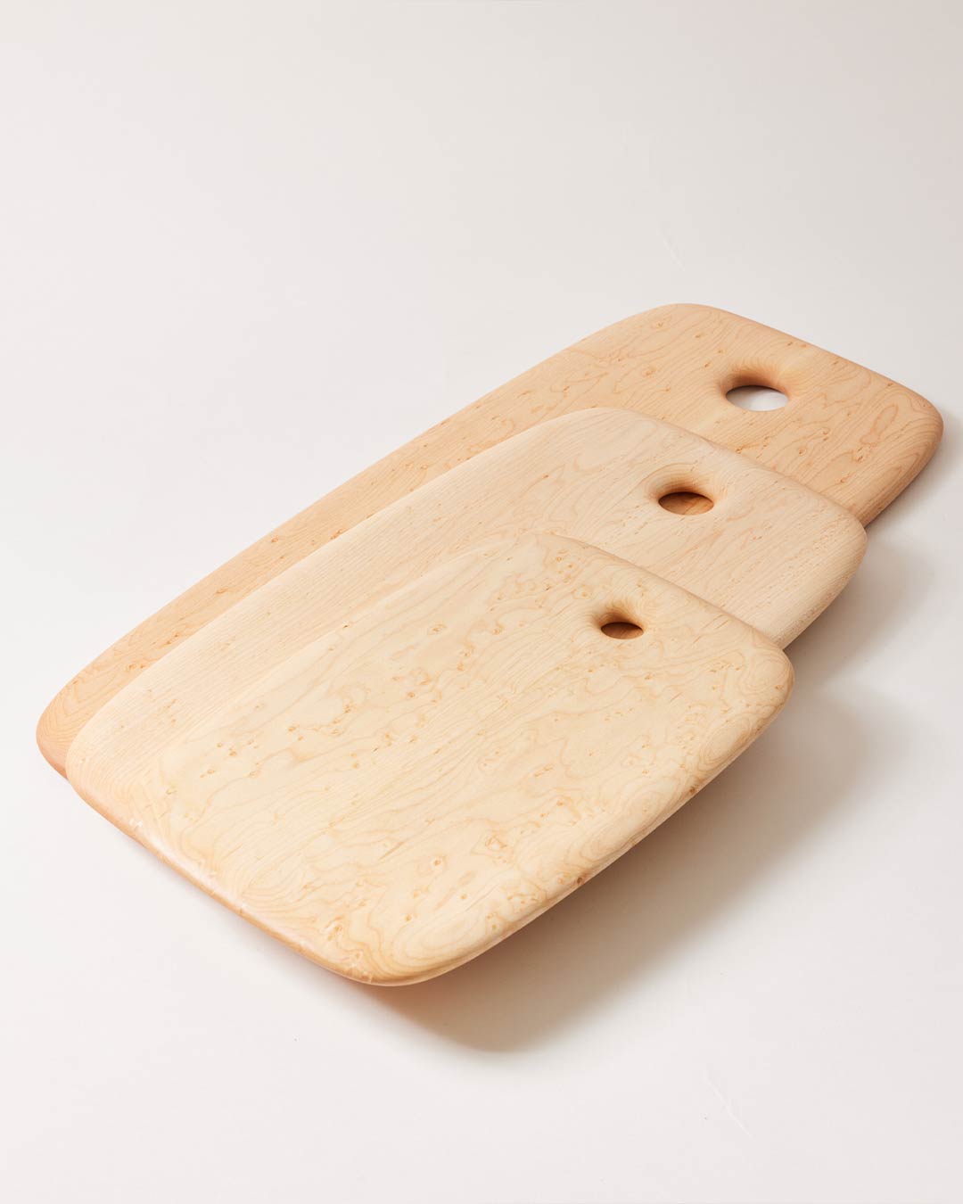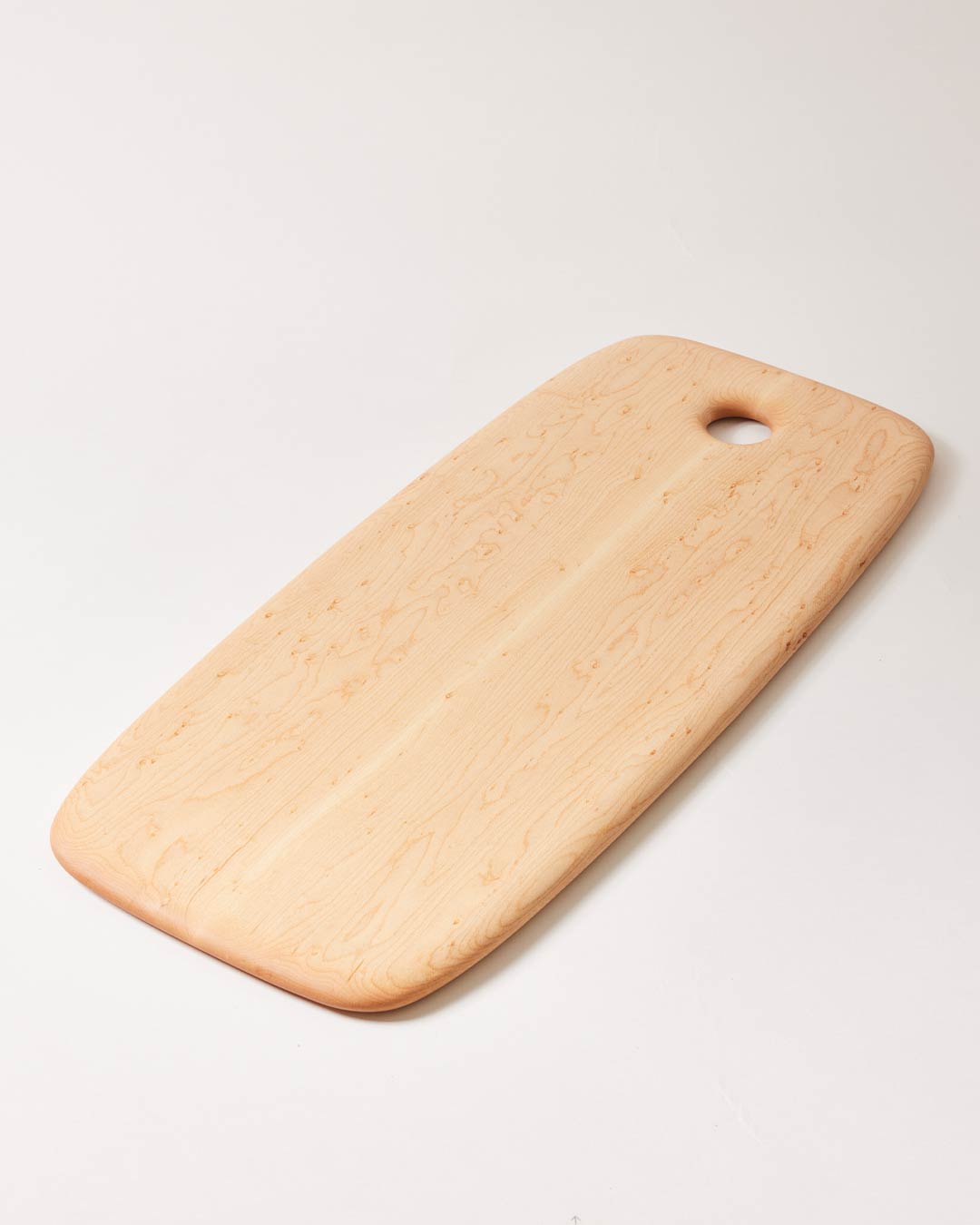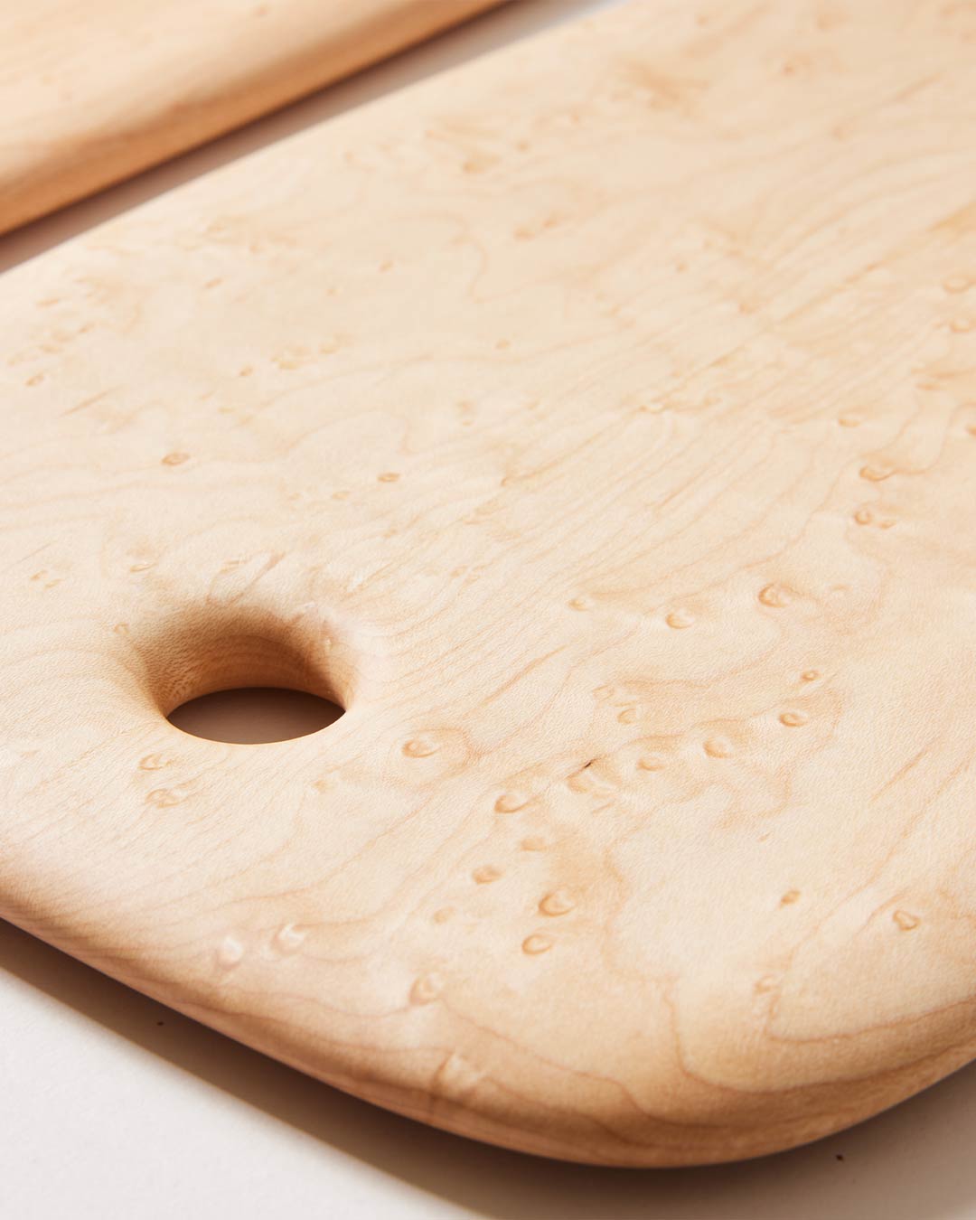 Handcrafted with stunning artistry and attention to detail, these solid birdseye maple boards are worthy of display as art and will provide years of hardworking service in your kitchen. Crafted and joined from a single piece of specially selected maple for consistency throughout, each one is precision-shaped and beveled for a uniquely graceful, organic shape. Individually sanded, finished and oiled by hand until completely smooth. Due to the natural material composition, wood grain and tones will vary from piece to piece.