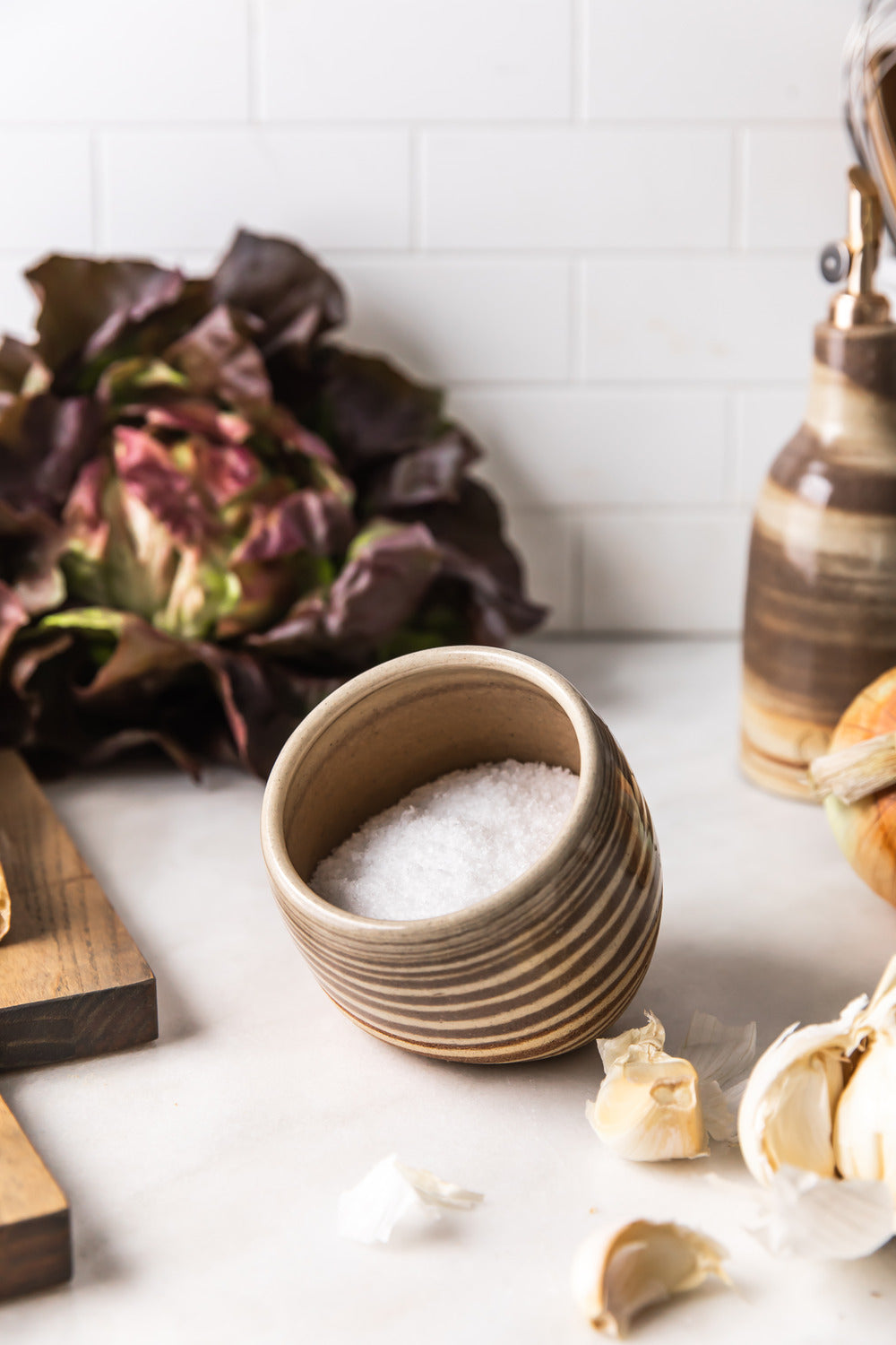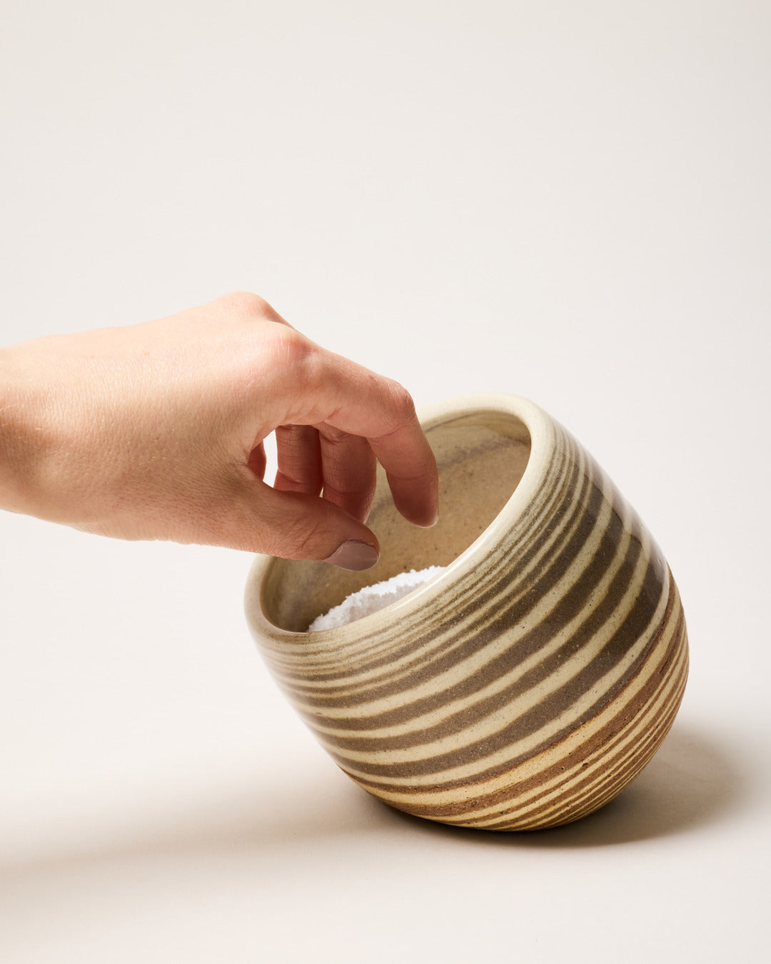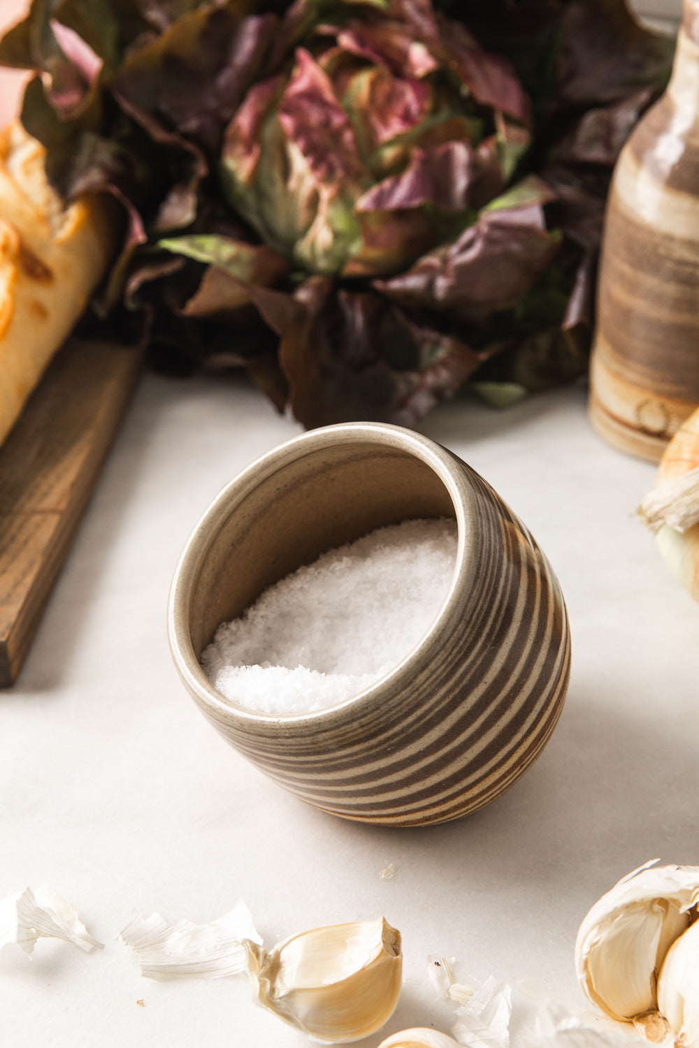 Hand-thrown from a blend of multiple clays, our Marbled Stone Salt Cellar captures the organic magic of sediment, stone, and movement. The swirling surface pattern is created through a careful wedging and wheel-throwing process, giving each piece a uniquely layered effect. Whether used for salt, spices, or as a sculptural kitchen accent, it's a beautiful balance of form and function — no two are alike.