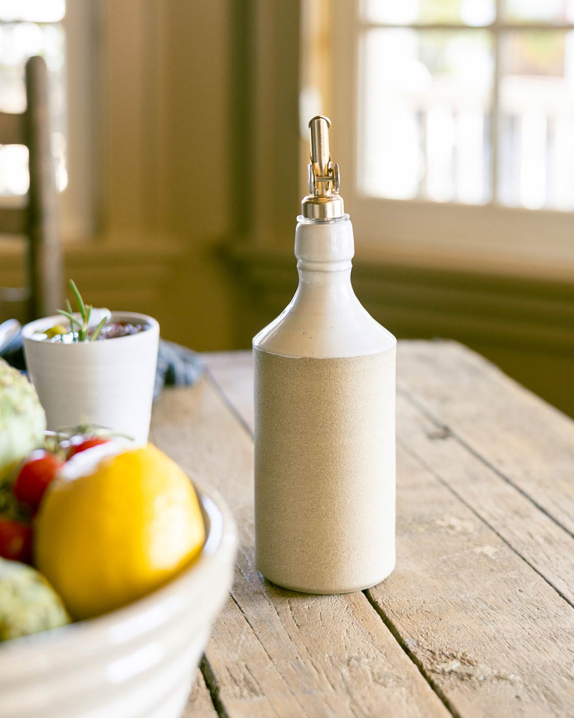Inspired by the distinctive shape of antique ginger beer bottles, our Vintage Olive Oil Bottle brings a touch of history to your kitchen. Crafted from custom American-mined clay, the bottle showcases the natural tones and raw beauty of its materials, echoing the craftsmanship of production pottery from days gone by. Perfect for storing and serving your favorite oils, this bottle adds a rustic, vintage charm to your countertop while honoring the traditions of timeless design.