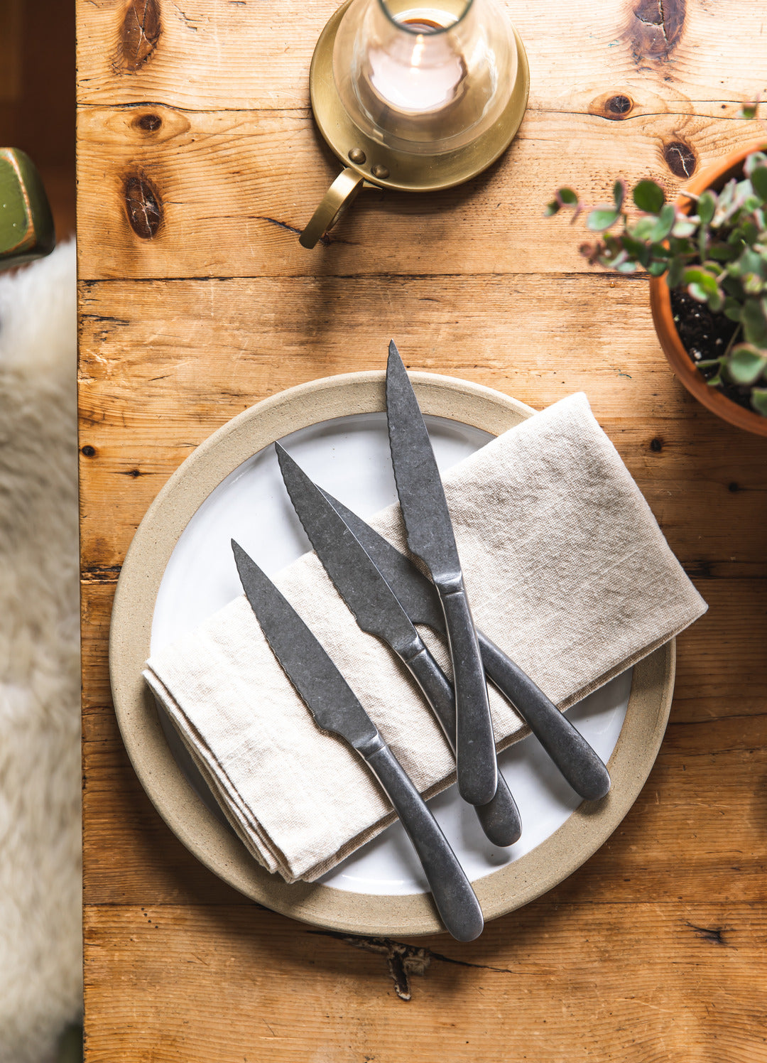 A cut above the rest—our Windrow Steak Knives are crafted for everyday rituals and special meals alike. Featuring a vintage finish, gently curved handles, and classic serrated blades, this set of four brings form and function to the table. Whether slicing into a Sunday roast or a weeknight steak, each knife feels grounded, balanced, and built to last. Mix and match with your favorite flatware or use them as a handsome standalone set.